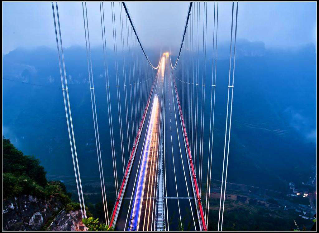 兩座高聳的山峰之間,湖南吉首矮寨特大懸索橋像一道彩虹,掛在大峽谷上,與下面的盤(pán)山公路遙相輝映。霧中有橋,橋中有霧,雄壯不失嫵媚。