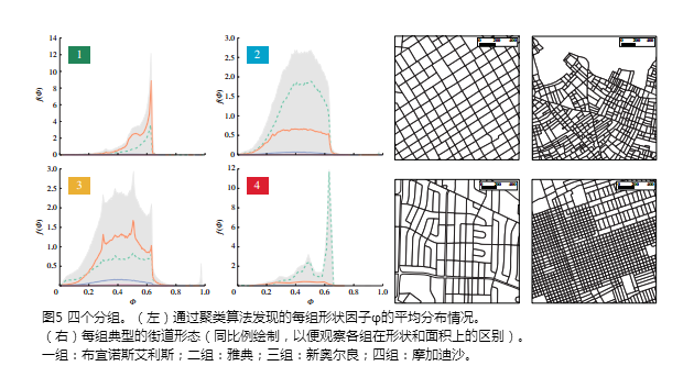 他們將那些城市地塊的尺寸、形狀繪制出來:有些城市的地塊形狀統(tǒng)一;另一些則有更多小型、曲線圍成的地塊。他們比較了地塊的不同分布,將眾多城市劃入四個不同“組別”: