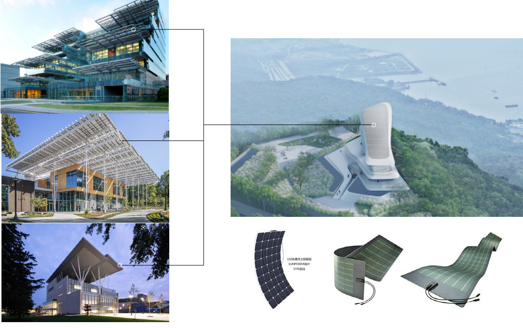 在綠色節(jié)能設(shè)計(jì)方面,建筑屋頂采用柔性太陽能光伏發(fā)電板滿鋪模式。綠色低碳,節(jié)能減排,是響應(yīng)國家減碳降排、綠色節(jié)能的建筑設(shè)計(jì)要求。