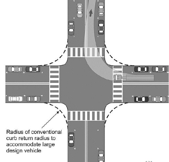 車輛轉(zhuǎn)彎都會(huì)形成內(nèi)輪差和外輪差,對(duì)其他用路人形成威脅。因此,在小半徑轉(zhuǎn)彎中,應(yīng)對(duì)該交叉口的所有用路人進(jìn)行流線分析,并據(jù)此形成必要的隔離和控制,確保安全。在美國(guó)的規(guī)范里,交叉口的轉(zhuǎn)彎半徑,即便直角也是可行的,但要有一大堆方法解決不同用路人的轉(zhuǎn)彎。如果僅僅縮小轉(zhuǎn)彎半徑,而沒有針對(duì)用路人做必要轉(zhuǎn)彎流線優(yōu)化,并有必要的控制措施,會(huì)極大的增加風(fēng)險(xiǎn),并降低交叉口的容量。因此,形成小半徑彎道,不在于彎道半徑是多少,而在于如何確保安全和容量。圖片來源:徐耀賜/交叉口設(shè)計(jì)