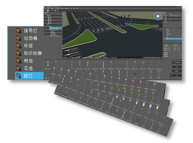 然后,通過3DRoad自動(dòng)生成三維道路,批量加載道路附屬設(shè)施,自動(dòng)拉伸三維建筑或者加載三維建筑的BIM、3dmax等模型,集成三維場(chǎng)景;