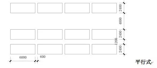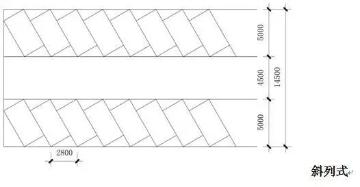 根據(jù)地形條件以占地面積小、疏散方便、保證安全為原則,主要停車方式有平行式、斜列式、垂直式三種。其中間最小距離以小型車為例,停車方式見(jiàn)下圖