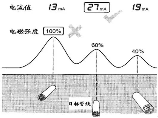 當(dāng)用直接法工作時,被施加信號的目標(biāo)管線上電流最大,而其它并行管線電流為感應(yīng)電流,電流值較小,通過測量出電流值大小方法區(qū)分出目標(biāo)管線。(如圖)