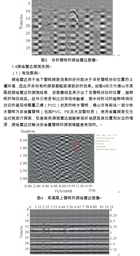 電磁法探測管線需要在目標管線上加載和傳遞電流,因此要求目標管線需是金屬等導電材質(zhì),而對于非金屬管線來說,它不具備導電的性質(zhì),使用電磁法探測就失去了效果。隨著城市非金屬材質(zhì)地下管線的鋪設越來越常見,傳統(tǒng)的金屬管線探測儀已不能滿足地下管線探測的要求,而探地雷達技術作為新的探測手段,能夠完成非金屬管線的探測工作,彌補了金屬探測儀的不足。