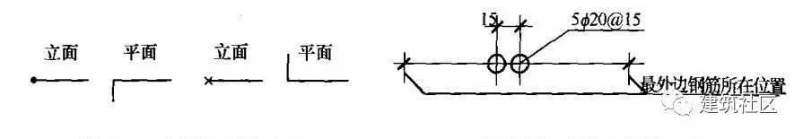 (9)在鋼筋構(gòu)造圖中,當(dāng)有指向閱圖者彎折的鋼筋時,應(yīng)采用黑圓點表示;當(dāng)有背向閱讀者彎折的鋼筋時,應(yīng)采用“X”表示(圖2—55)