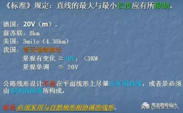 公路線形應與地形相適應,與景觀相協(xié)調,直線的最大長度應有所限制,當采用長的直線線形時,為彌補景觀單調的缺陷,應結合具體情況采取相應的技術措施。