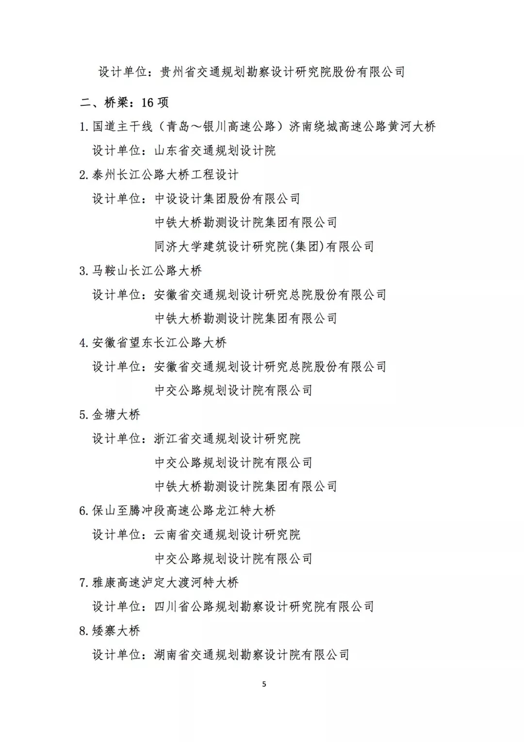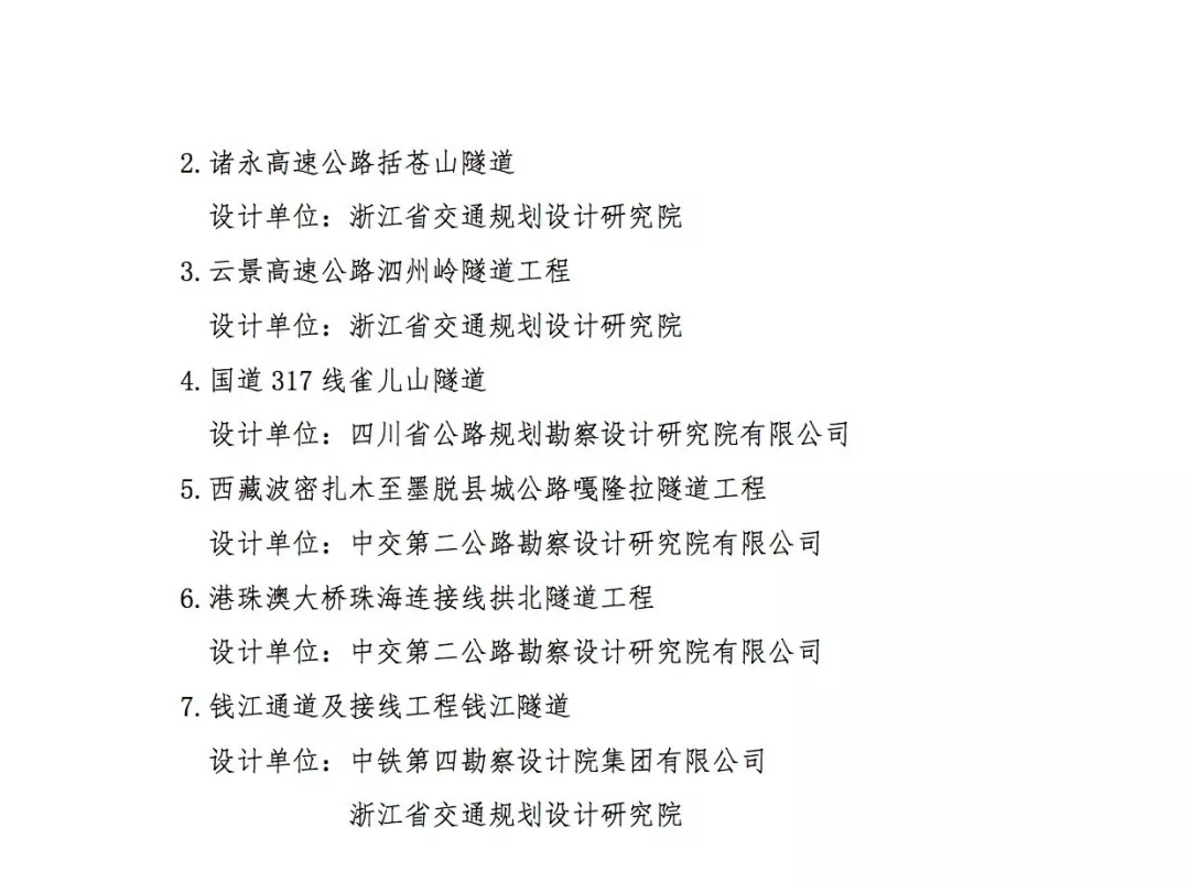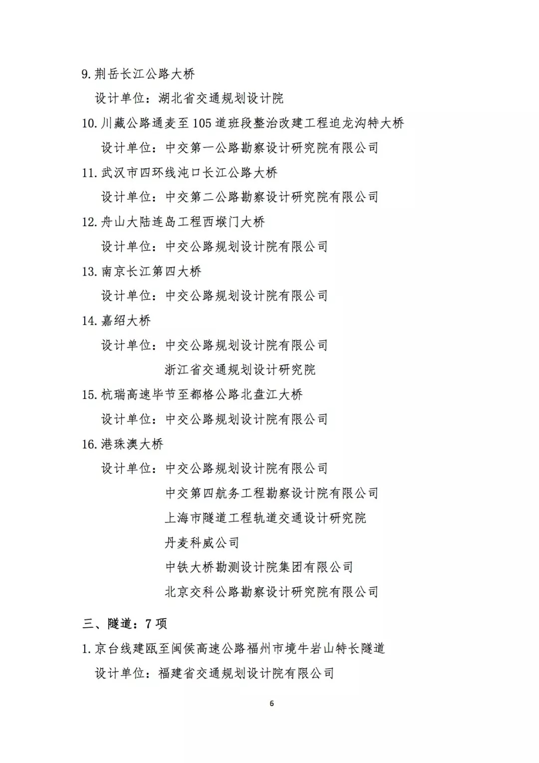 本次獲獎的62個項目中,公路工程39項,橋梁工程16項,隧道工程7項。其中中交公路規(guī)劃設(shè)計院有限公司參與的14個項目獲獎。