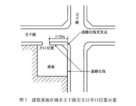 中等城市、大城市的主干路交叉口,自道路紅線交叉點(diǎn)起沿線70.0m范圍內(nèi)不應(yīng)設(shè)置機(jī)動(dòng)車出入口。