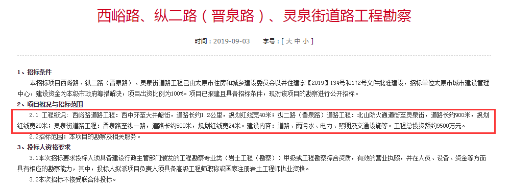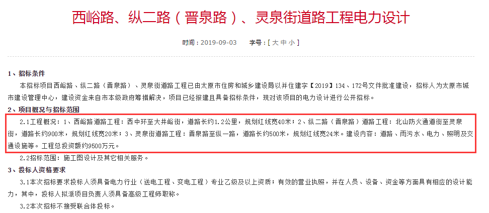 根據(jù)招標顯示,本招標項目西峪路、縱二路(晉泉路)、靈泉街道路工程已由太原市住房和城鄉(xiāng)建設(shè)委員會以并住建字【2019】134號和172號文件批準建設(shè),招標單位太原市城市建設(shè)管理中心,建設(shè)資金為本級市政府籌措解決,項目出資比例為100%。