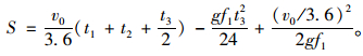 式中,v0為汽車運行速度;f1為縱向摩阻系數(shù),依車速及路面狀況而定;g為重力加速度(9.8 m/s2);t1為駕駛者反應時間,取2.5 s(判斷時間1.5 s,運行時間1.0 s)。