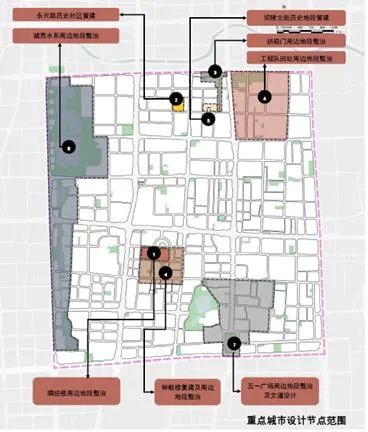 八個空間景觀節(jié)點包括:唱經(jīng)樓周邊地段、永興路歷史社區(qū)、拱極門周邊地段、鐘鼓樓復(fù)建及周邊地段、壩陵北街歷史地段、工程隊舊址周邊地段、五一廣場周邊地段及文道設(shè)計、城西水系周邊地段。