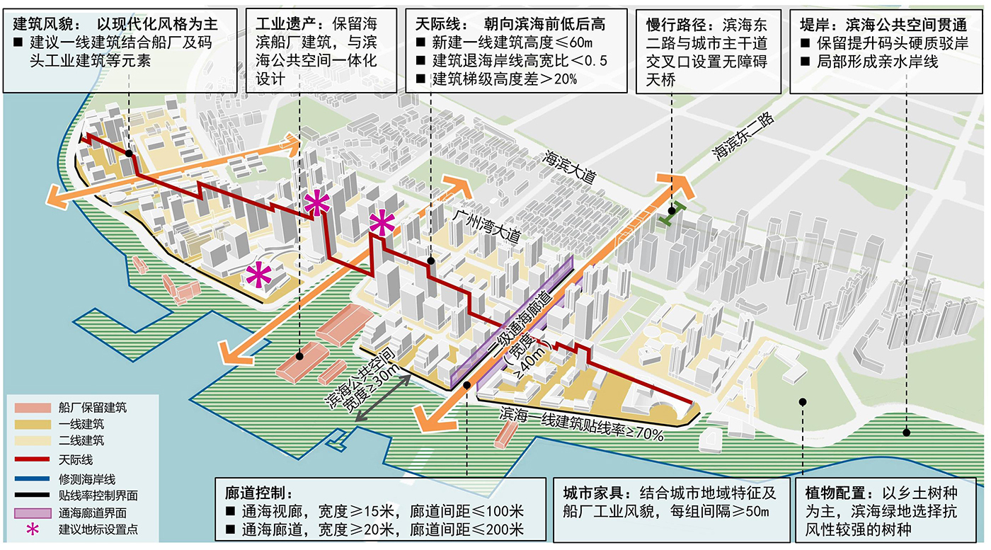 管控要點(diǎn):結(jié)合船廠工業(yè)遺產(chǎn),垂直海岸線控制多條通海廊道??刂菩陆ㄒ痪€建筑高度≤60m,建筑退海岸線高寬比<0.5,建筑梯級高度差> 20%,形成由濱海向內(nèi)陸前低后高的天際線。