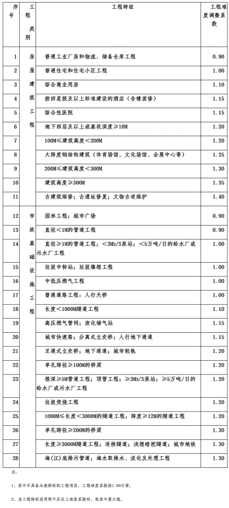 工程復(fù)雜程度分為一般、較復(fù)雜和復(fù)雜三個等級,其調(diào)整系數(shù)分別為:一般(Ⅰ級)0.85;較復(fù)雜(Ⅱ級)1.0;復(fù)雜(Ⅲ級)1.15。
