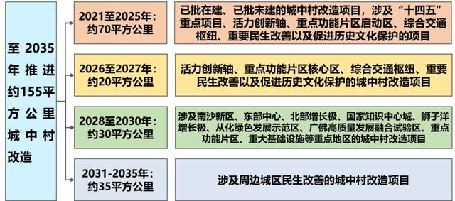 《專項(xiàng)規(guī)劃》統(tǒng)籌新增用地與存量用地資源配置,規(guī)劃至2025年,累計(jì)推進(jìn)城市更新約130平方公里(含城中村改造70平方公里);至2030年,累計(jì)推進(jìn)城市更新約230平方公里(含城中村改造120平方公里);至2035年累計(jì)推進(jìn)城市更新約300平方公里(含城中村改造155平方公里),通過微改造、混合改造、全面改造多種方式并舉,推動(dòng)低效存量土地的盤活再利用。
