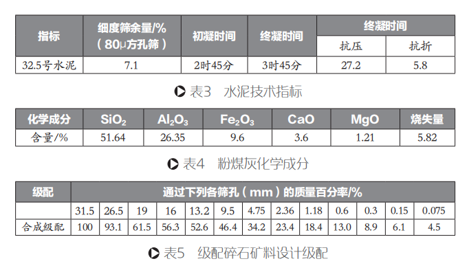 底基層:該路面結(jié)構(gòu)底基層采用水泥粉煤灰穩(wěn)定碎石,為減少半剛性基層材料層裂縫,需使用較高模量的水泥穩(wěn)定碎石,而高模量的路面結(jié)構(gòu)通常需使用較高劑量的水泥。但就半剛性基層材料自身的特性而言,高劑量水泥通常會(huì)使路面早期出現(xiàn)一定程度的干縮和溫縮裂縫。因此本文采用3%的32.5號(hào)水泥,同時(shí)結(jié)合摻加火力發(fā)電廠除塵裝置收集的粉煤灰,其水泥和粉煤灰技術(shù)指標(biāo)如表3、表4所示。
