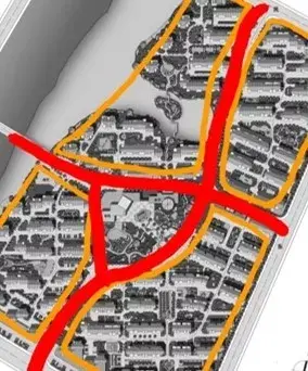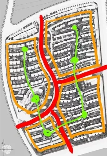 強調(diào)南北主線, 通過錯開的方式獲得變化,內(nèi)部加入環(huán)形路聯(lián)系四個組團中心,適合低密度產(chǎn)品。