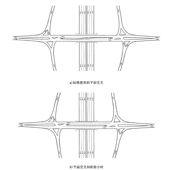 《規(guī)范》11.6.2條規(guī)定,菱形或苜蓿葉互通中的兩個平面交叉宜相互通視,凸曲線應(yīng)保證停車視距,間距應(yīng)容納兩個左轉(zhuǎn)車道,不宜設(shè)置人行橫道。