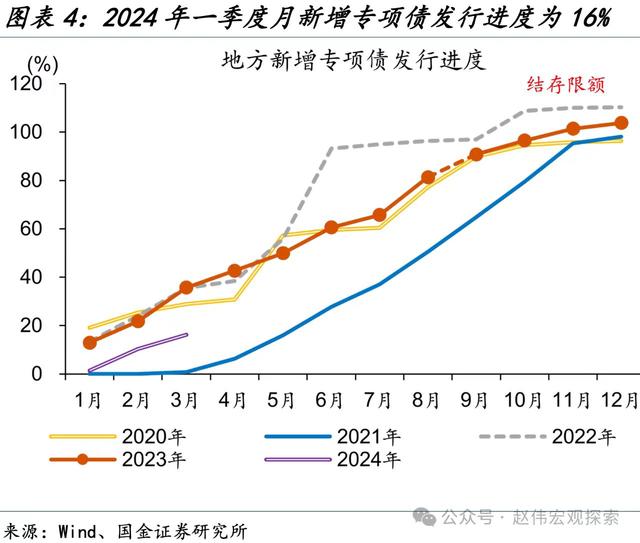 不過(guò),今年以來(lái)專項(xiàng)債發(fā)行進(jìn)度明顯慢于去年。公開(kāi)數(shù)據(jù)顯示,2024年一季度,地方新增專項(xiàng)債共發(fā)行約6341億元,同比下降約53%,已發(fā)行額度占全年新增專項(xiàng)債額度比重(發(fā)債進(jìn)度)僅16%,遠(yuǎn)低于去年同期的35%。而4月份以來(lái)專項(xiàng)債發(fā)行也并未出現(xiàn)明顯提速跡象。