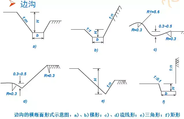 ①排水溝的橫斷面一般采用梯形,尺寸大小應經(jīng)過水力水文計算選定;