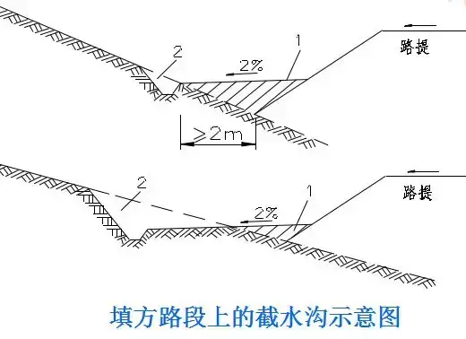 2.截水溝:又稱天溝,一般設置在挖方路基邊坡坡頂以外,或山坡路堤上方的適當?shù)攸c,用以攔截并排除路基上方流向路基的地面徑流。
