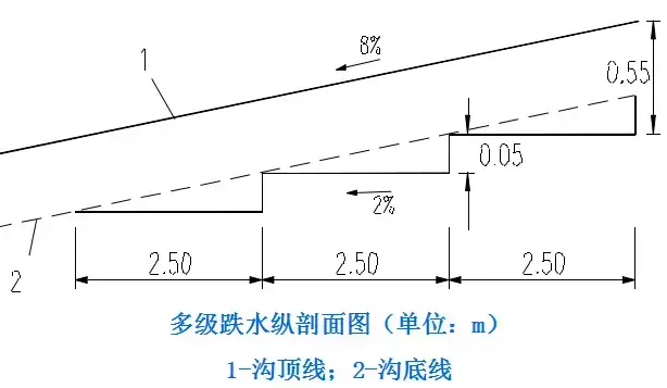 5.急流槽:在陡坡或深溝地段設置的坡度較陡、水流不離開槽底的溝槽稱作急流槽。急流槽的作用是在較短的距離內(nèi)以溝渠的方式引排水流、降低水頭,進而防止沖刷(可用于比跌水更陡的坡度,可達600)。