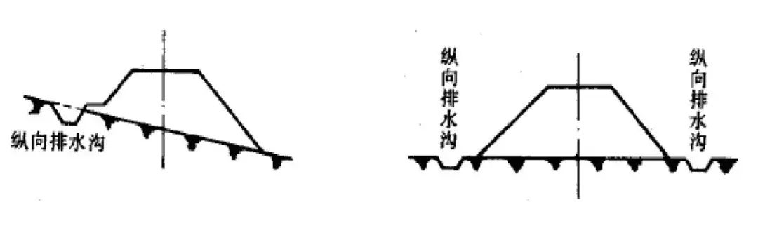 上圖用于排出路堤范圍內(nèi)的地面水:當(dāng)?shù)孛嫫教箷r(shí)設(shè)于路基的兩側(cè);當(dāng)?shù)孛孑^陡時(shí)可設(shè)置于迎水面一側(cè)。