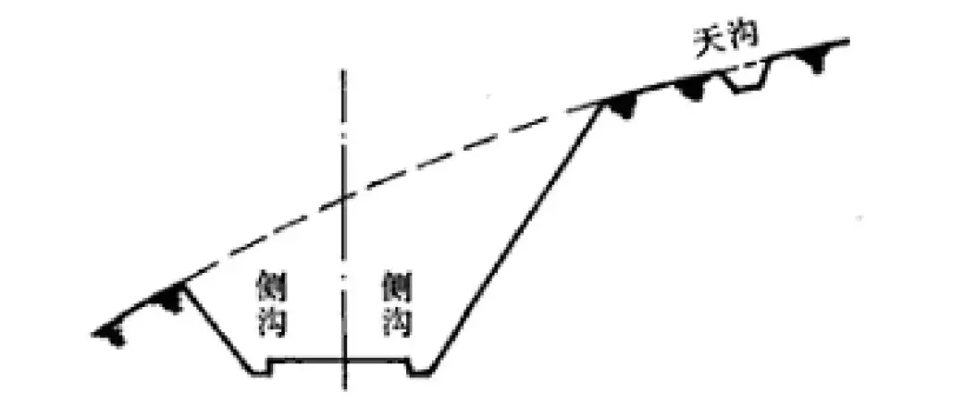 天溝設(shè)于路塹塹頂,用以排除山坡迎水方向流向路塹的地面水。路塹頂部無棄土堆時(shí),天溝內(nèi)邊緣至塹頂距離不宜小于5m;當(dāng)溝內(nèi)進(jìn)行加固防滲時(shí)不應(yīng)小于2m。