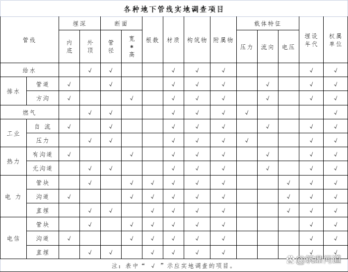 地下管線調(diào)查項(xiàng)目有地下管線的平面位置、埋深(或高程)、流向、壓力以及管線規(guī)格、性質(zhì)、材料、權(quán)屬等屬性。