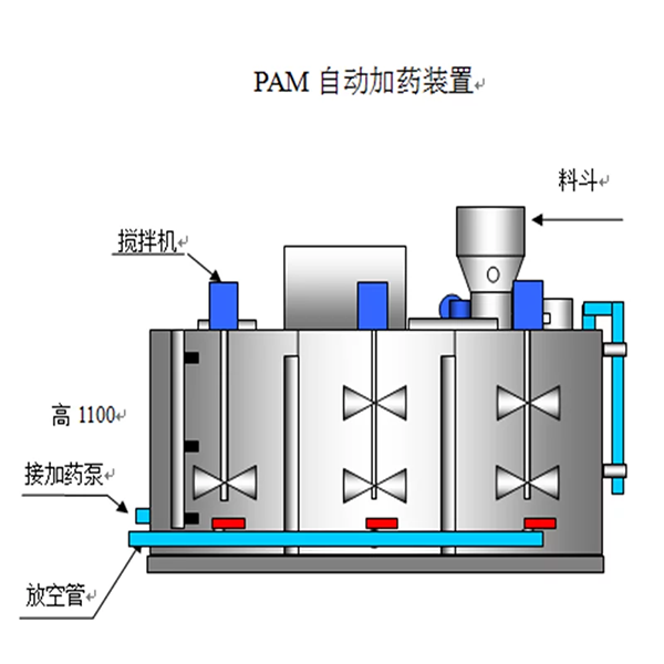 裝置工作原理:干粉絮凝劑加入干粉料斗后,按設(shè)定的配比濃度,由螺桿給料機(jī)定量輸入溶解箱內(nèi),與定量的清水混合,經(jīng)過攪拌器攪拌、熟化后,由計(jì)量泵將混合液外輸至加藥點(diǎn) 。