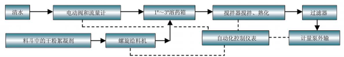 在污水處理系統(tǒng)中,為了除去或降低水中懸浮物,使其產(chǎn)生大顆粒的凝聚體,加快水中雜質(zhì)和污泥沉降速度,一般在污水處理的沉降部分加入一定濃度的絮凝劑。用于含油污水處理的絮凝劑包括無機(jī)絮凝劑、有機(jī)絮凝劑和復(fù)合絮凝劑 3 大類。為了保證加藥濃度、減輕工人勞動(dòng)強(qiáng)度和降低藥劑成本,應(yīng)用絮凝劑自動(dòng)加藥工藝技術(shù)。